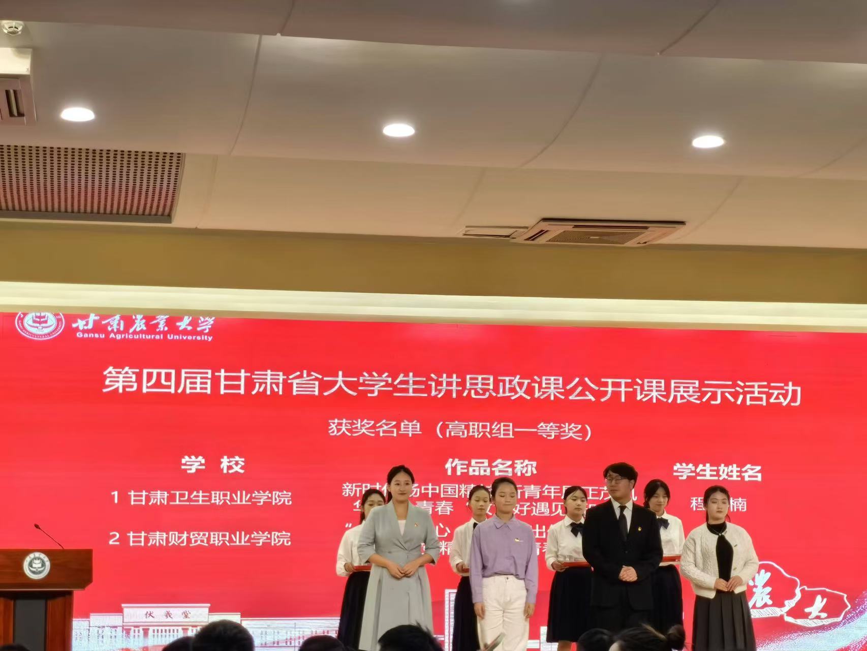10月26日,第四届甘肃省高校大学生讲思政课公开课展示活动现场决赛在甘肃农业大学举行。学校推荐的两部作品全部获奖,其中由程祎楠同学主讲的《新时代扬中国精神 新青年展正茂风华——青春“政”好遇见新时代》荣获高职组一等奖第一名,由罗培哲、豆喜娟同学主讲的《八步沙里三代人 敢在大漠绘丹青——我看家乡这十年》荣获高职组二等奖第一名。