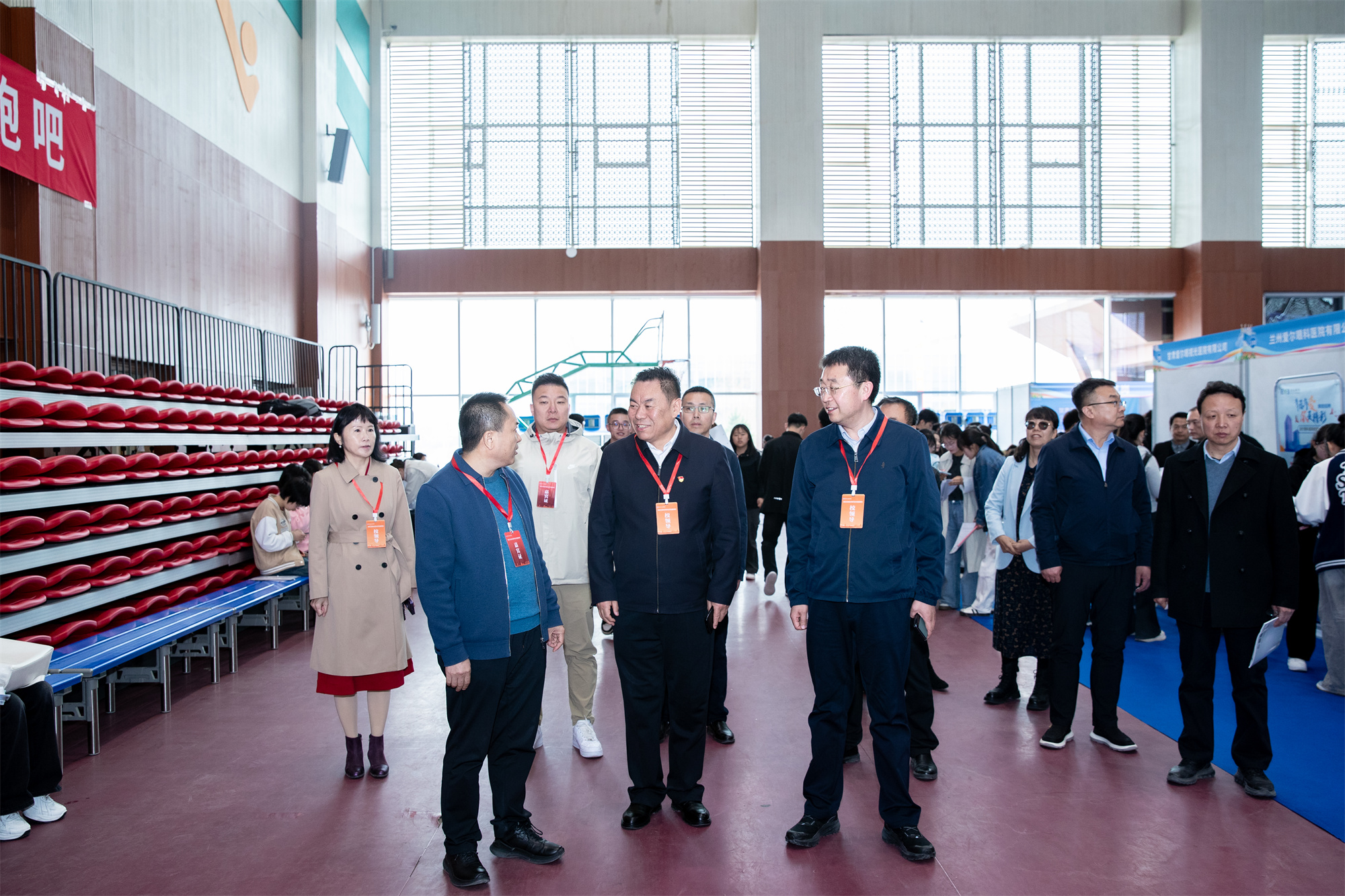 招聘会现场气氛热烈,人潮涌动。来自英国365上市官网、培黎职业学院、兰州科技职业学院的2000余名学生手持精心准备的简历,穿梭于各个展位之间,积极与招聘人员交流,了解企业的发展情况、岗位需求和薪资待遇等信息,主动展示自己的专业技能和综合素质,大胆展现才华,努力争取心仪的工作机会。各用人单位的招聘展位前也围满了咨询的学生,招聘人员耐心地解答同学们的疑问,介绍企业的优势和岗位要求,不少企业还在现场进行了初步面试。甘肃省卫生健康委员会人才服务中心主任陆保意、兰州新区教育和卫生健康委员会副主任李家宏与学校党委书记包磊、校长王建成、副校长张军荣到现场指导工作,并与用人单位、求职毕业生亲切交流。