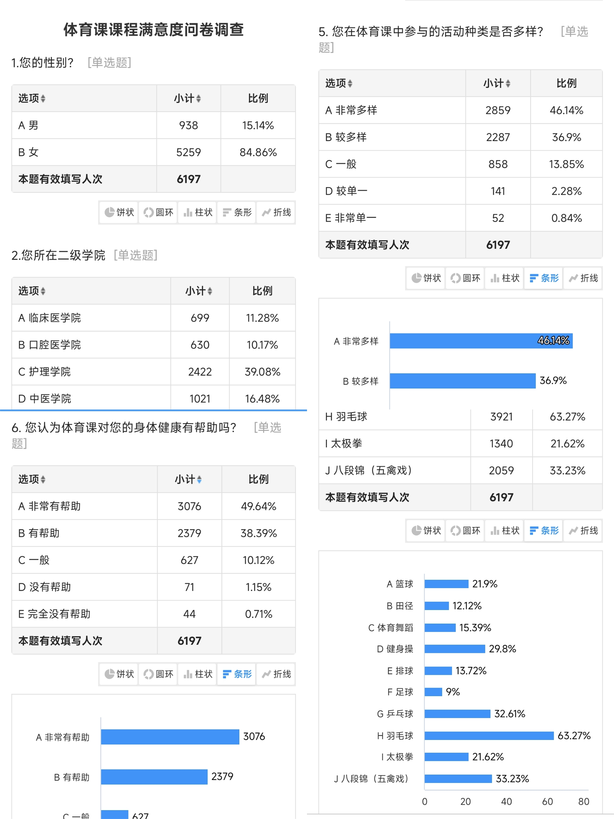 本次教学反馈会采用线上发放调查问卷和现场会议相结合的形式开展。参与问卷调查的学生达6197人,较全面反映了体育课程的各个方面;现场参会的学生代表积极发言,从教学内容、难易程度、校园竞赛、课外活动、体质监测、场地器材等多个方面,分享了自己的学习体验和意见。
