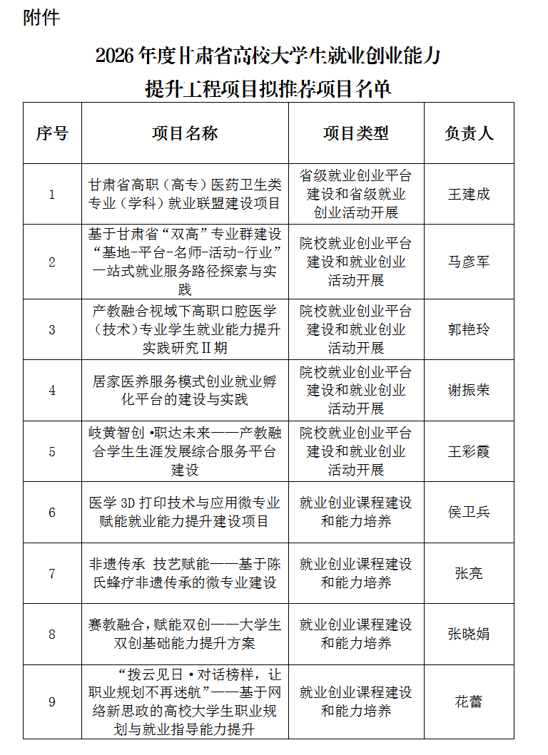 根据甘肃省教育厅《关于开展2026年度甘肃省高校大学生就业创业能力提升工程项目申报工作的通知》要求,经招生实习就业与校企合作科组织、各负责人申报、校内评审等环节,现拟推荐《甘肃省高职(高专)医药卫生类专业(学科)就业联盟建设项目》申报第一类“省级就业创业平台建设和省级就业创业活动开展”项目,《基于甘肃省“双高”专业群建设“基地-平台-名师-活动-行业”一站式就业服务路径探索与实践》等4个项目申报第二类“院校就业创业平台建设和就业创业活动开展”项目,《医学3D打印技术与应用微专业赋能就业能力提升建设项目》等4个项目申报第三类“就业创业课程建设和能力培养”项目,现予以公示。