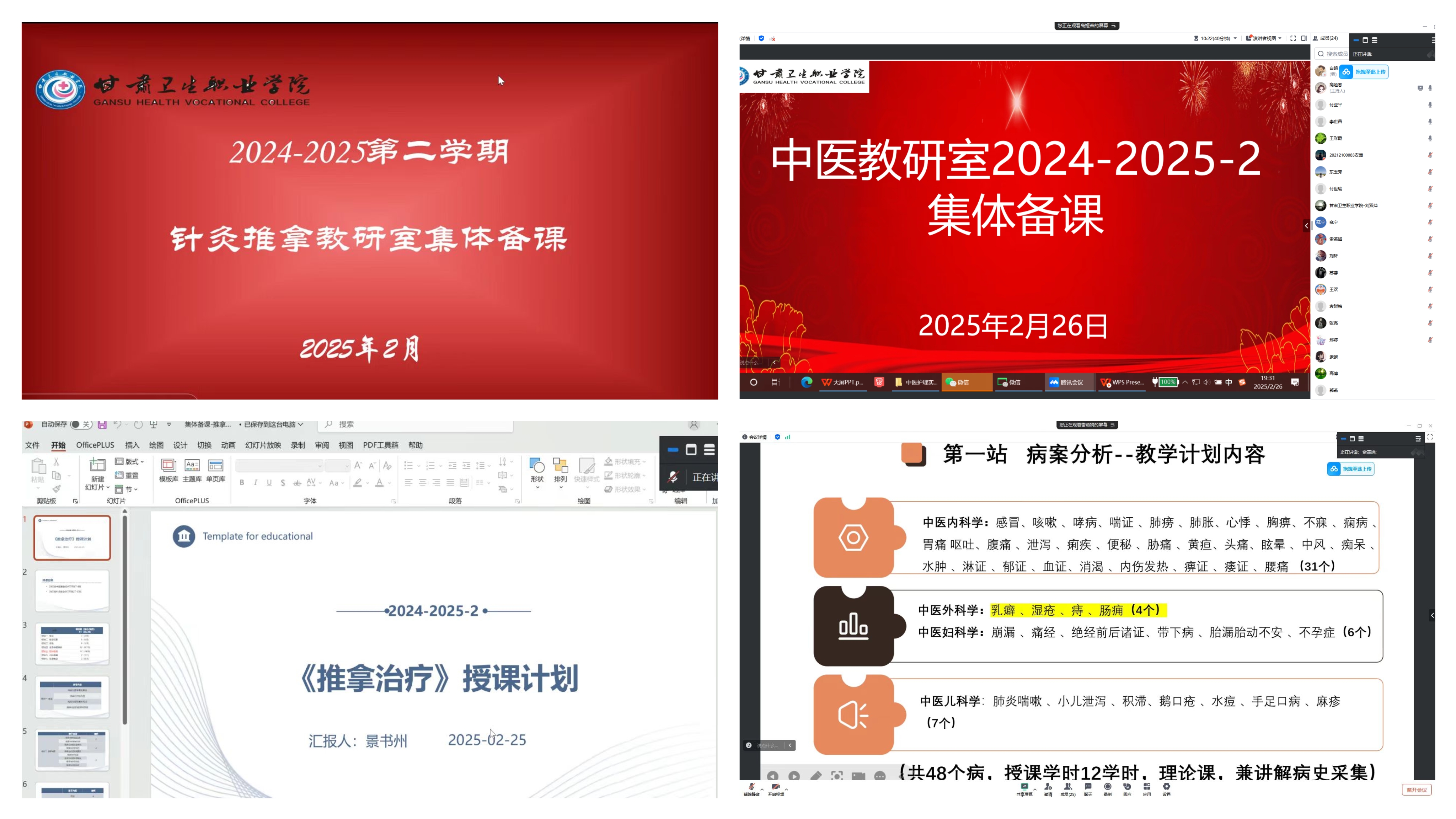 为充分做好开学准备,中医学院于2月25日至2月27日组织针灸推拿教研室和中医学教研室各学科开展线上集体备课活动。校领导高博、杨频,学院院长王彩霞、副院长郭燕、教科研办公室工作人员及全体专兼职教师参加了此次活动。