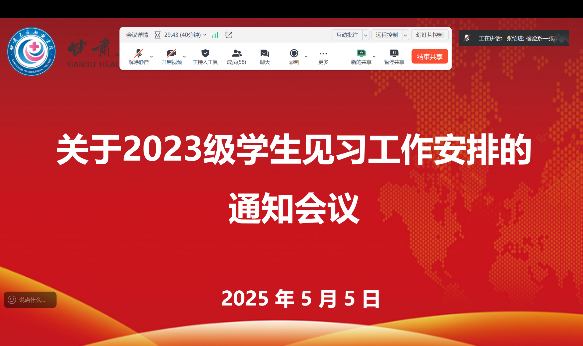 为确保我院23级学生顺利完成本学年教学见习,5月5日晚,通过线上召开了学院见习工作动员部署会议。会议由孙兴璐老师主持,张绍进书记、张娅妮副院长、白玉祥副书记出席。
