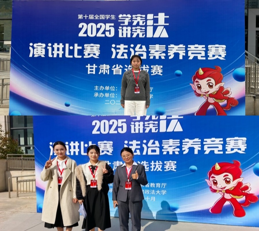 近期,由甘肃省教育厅主办、甘肃政法大学承办的第十届全国大学生“学宪法 讲宪法”活动甘肃省选拔赛圆满落幕。我校选派的学生代表张彤玲在这场高水平赛事中夺得演讲二等奖,创下我校在此项赛事中的历史最佳成绩。高心如、马九红、谢靓欣团队夺得法治素养竞赛三等奖。