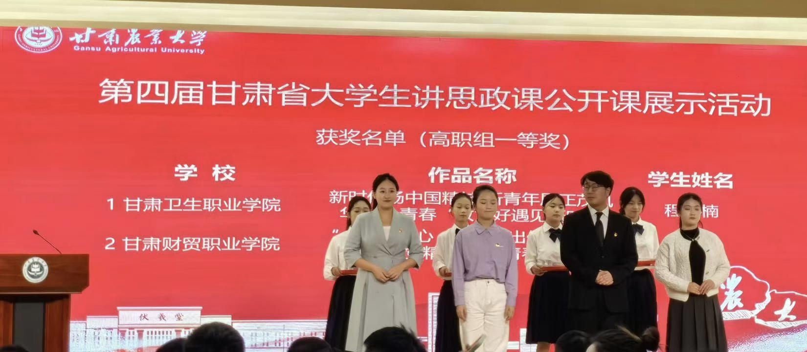 10月26日,第四届甘肃省高校大学生讲思政课公开课展示活动现场决赛在甘肃农业大学举行。学校推荐的两部作品全部获奖,其中由程祎楠同学主讲的《新时代扬中国精神 新青年展正茂风华——青春“政”好遇见新时代》荣获高职组一等奖第一名,由罗培哲、豆喜娟同学主讲的《八步沙里三代人 敢在大漠绘丹青——我看家乡这十年》荣获高职组二等奖第一名。