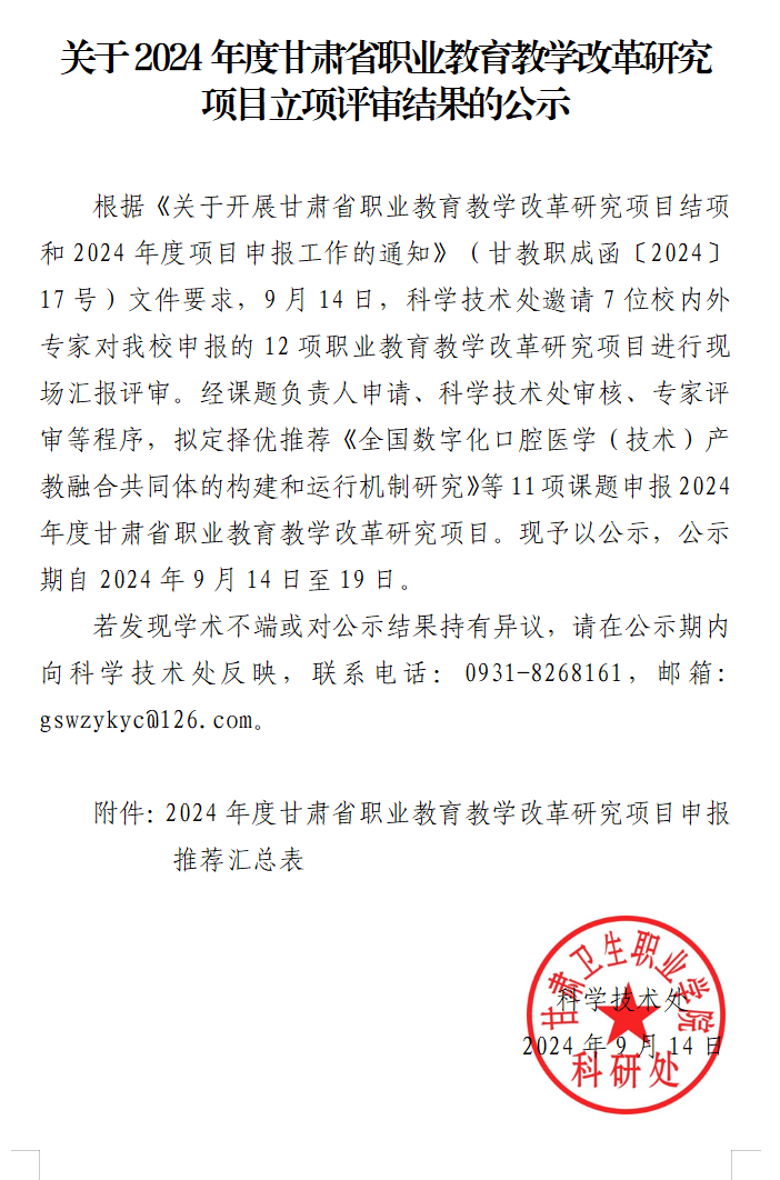 关于2024年度甘肃省职业教育教学改革研究 项目立项评审结果的公示发布时间:2024-09-14 -